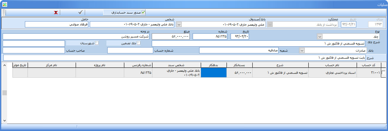 عمليات بانكي: از اين گزينه در زمان عمليات واريز و برداشت، بين حساب هاي بانكي شركت استفاده مي شود.