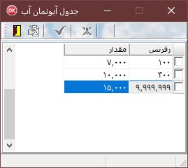 اين پنجره به منظور تعريف جدول تعرفه مصرف آب اختصاص دارد و به صورت پلكاني تعريف ميشود و داراي دوبخش نوار ابزار و جدول اصلي مي باشد،نوار ابزار شامل كليد هاي ثبت تغييرات، انصراف از تغيرات و كليد خروج و جدول اصلي شامل ستون هاي رفرنس و مقدار مي باشد كه به نفصيل هر كدام شرح داده خواهد شد