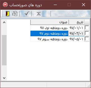 فرض كنيد ميخواهيم يك دوره در سال 1397 و از ابتداي سال تعريف نماييم در اين صورت در رديف اول در ستون تاريخ 97/01/01 را وارد مي نماييم و در ستون عنوان عبارت "دوره دوماهه اول 97" را وارد مينماييم و در رديف دوم ستون تاريخ 97/03/01 را وارد نموده و در ستون عنوان عبارت "دوره دو ماهه دوم 97" را وارد مي نماييم، در نتيجه باز زماني دوره اول از تاريخ 97/01/01 تا 97/02/31 خواهد بود و تعداد روز هاي اين دوره برابر 62 روز مي باشد و دوره دوم از تاريخ 97/03/01 شروع خواهد شد و هر زمان دوره سوم را تعريف نماييم پايان دوره دوم يك روز قيل از شروع دوره سوم خواهد بود.