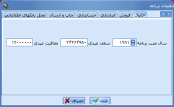 در اين حوزه، مبلغ سقف عيدي قابل پرداخت به پرسنل در سال مالي مورد نظر، ثبت مي گردد. بديهي است هر سال، ميبايست مبلغ جديد، مجددا درج شود(اين عدد معمولا سه برابر حداقل حقوق پايه سال جاري محاسبه، مي باشد).