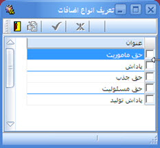 اين پنجره، به منظور تعريف انواع مبالغي كه ميتواند به طور مقطعي و تحت عناوين متفاوتي مانند پاداش، به پرسنل پرداخت گردد، تعبيه شده است.
