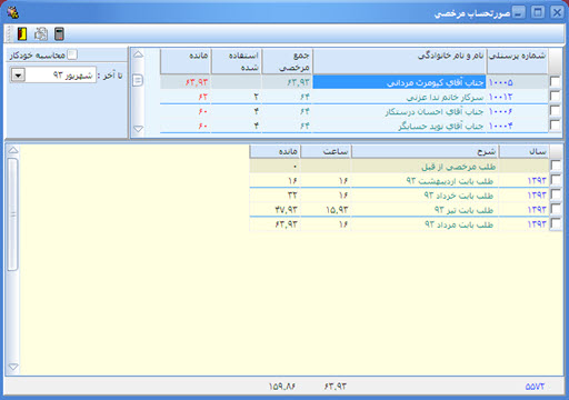 با استفاده از اين گزارش، ميتوان ريز صورتحساب مرخصي پرسنل را مشاهده نمود. در اين پنجره نيز، دو جدول براي نمايش اطلاعات تعبيه شده است. جدول بالايي شامل مشخصات پرسنل و اطلاعات مرخصي وي مي باشد؛ كه با انتخاب شخص مورد نظر، صورتحساب مرخصي به تفكيك دوره حقوق، نمايش داده مي شود.