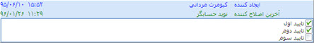 هر كاربري كه با كلمه عبور خود وارد سيستم ميشود، ميتواند در صورت داشتن مجوز، فاكتور را تاييد نمايد. بدين منظور سه تاييد در قسمت انتهايي پنجره فاكتور ، تعبيه شده اند. درصورتيكه كاربر داراي اين مجوز باشد (رجوع به فصل "تعاريف" مبحث "تعريف كاربران")، بسته به نوع مجوز (تاييد اول، دوم و يا سوم)، گزينه متناظر آن فعال شده و كاربر ميتواند با انتخاب آن، فاكتور را تاييد نمايد. بعنوان مثال در نظر بگيريد كه شركتي داراي صادر كننده، مدير فروش و حسابدار فروش باشد.