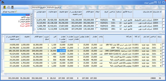 اين گزارش كليه اسناد موجود در سيستم را با نمايش مي دهد اين گزارش شامل چهار بخش است ابتدا بايست دسته فاكتور مورد نظر را از قسمت انتخاب دسته فاكتور ها مشخص نمود كليه فاكتورها و يا پيش فاكتورهاي ثبت شده در سيستم مربوط به دسته فاكتور انتخاب شده با مشخصات كامل به عنوان مثال دسته فاكتور،تاييد ،شاخص،... در جدول فوقاني نمايش ميابد ستونهاي قابل رويت اين جدول عبارتند از : " كد مشتري"،" نام مشتري"،" قسمت"،" عنوان"،" تلفن"،" فاكس"،" آدرس"،" دسته فاكتور"،" سال"،" ماه"،" نوع"،" خريد"،" فروش"،" تاييد"،" شماره"،" شاخص"،" تاريخ"،" شماره دستي"،" اعتبار"،" رزرو"،" ش درخواست"،" ابطال"،" فروشنده"،" تاريخ تاييد فروشنده"،" مدير فروش"،" تاريخ تاييد مدير فروش"،" حسابدار فروش"،" تاريخ تاييد حسابدار فروش"،" وضعيت"،" جمع اقلام"،" جمع مبلغ پس از