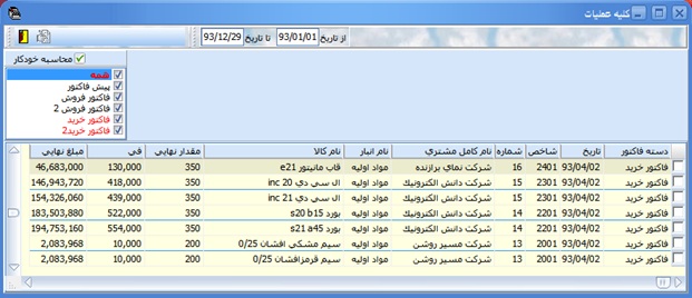 در اين گزارش كليه عمليات انجام شده در سيستم در سال مالي جاري براي همه دسته فاكتورها تعريف شده در سيستم با جزئيات مشخصات با استفاده از محدوده تاريخي (از تاريخ تا تاريخ) به صورت كامل نمايش مي يابد. ستونهاي قابل رويت اين جدول عبارتند از " نوع"،" دسته فاكتور"،" تاييد"،" سال"،" تاريخ"،" شاخص"،" شماره"،" رديف"،" شماره دستي"،" عنوان"،" وضعيت"،" ابطال"،" اعتبار"،" رزرو"،" شماره درخواست"،" كد مشتري"،" نام كامل مشتري"،" نام مشتري"،" تلفن مشتري"،" نمابر مشتري"،" اشخاص وابسته"،" قسمت مشتري"،" مسوول فروش"،" كد مسوول فروش"،" كد انبار"،" نام انبار"،" كد كالا"،" نام كالا"،" شرح"،" كيفيت"،" واحد كالا"،" واحد دوم"،" واحد"،" مقدار"،" مقدار برگشتي"،" مقدار نهايي"،" ضريب مقدار"،" مقدار با ضريب"،" مقدار برگشتي با ضريب"،" مقدار نهايي با ضريب"،" مقدار دوم"،" مقدار دوم برگشتي"،" مقدار دوم نهايي"،" في"،" ضريب مبلغ"،" جمع اقلام"،" تخفيف"،" جمع اقلام پس از كسر تخفيف"،" ماليات"،" عوارض"،" جمع نهايي اقلام"،" مبلغ برگشتي"،" ماليات برگشتي"،" عوارض برگشتي"،" جمع نهايي برگشتي"،" مبلغ نهايي"،" توضيح يك"،" توضيح دو"،" ايجاد كننده"،" تاريخ ايجاد"،" آخرين اصلاح كننده"،" تاريخ آخرين اصلاح"،" تاييد اول"،" تاريخ تاييد اول"،" تاييد دوم"،" تاريخ تاييد دوم"،" تاييد سوم"،" تاريخ تاييد سوم"