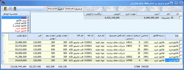 با انتخاب طبقه بندي مورد نظر و قرار گرفتن بر روي گزينه اشخاص اطلاعات مشتريان موجود در آن طبقه بندي و وضعيت حساب آنها بعنوان مثال جمع اقلام، جمع اضافات،جمع كسورات و ... نشان داده خواهد شد. در ستونهاي جمع اقلام، جمع اضافات، جمع كسورات و جمع نهايي به ترتيب جمع اقلام كل، جمع اضافات كل،جمع كسورات كل و جمع نهايي كل فاكتورهاي مربوط به مشتري مورد نظر در دوره زماني دلخواه درج مي گردد. با انتخاب مشتري دلخواه مشخصات و اطلاعات تمامي فاكتورها يا پيش فاكتورهاي مشتري كه درطول دوره زماني مورد نظر ثبت شده اند نمايش داده مي شوند. بعنوان مثال نام فاكتور، شاخص، شماره و ...