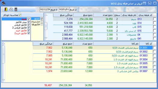 با انتخاب طبقه بندي مورد نظر و انتخاب گزينه كالاها، اطلاعات فروش كالاي فروخنه شده نمايش ميابد ستونهاي اين جدول عبارتند از: كد كالا، نام كالا، جمع تعداد، جمع مبلغ و ميانگين مبلغ. درستون ميانگين مبلغ، ميانگين مبلغ فروش كالاي مورد نظر در آن طبقه بندي كه از تقسيم جمع مبلغ بر جمع تعداد به دست مي آيد درج مي گردد. در صورت انتخاب طبقه بندي و گزينه مشتريان ليست مشترياني كه از كالاهاي اين طبقه بندي خريداري نموده اند نشان داده مي شوند.ستونهاي اين جدول عبارتند از :كد مشتري،نام مشتري، ن م، جمع تعداد، جمع مبلغ، ميانگين مبلغ. مشخصات فاكتورهاي متعلق به مشتري در زير آن نشان داده ميشود ستونهاي اين جدول عبارتست از: دسته فاكتور، نوع،تاييد،شاخص، شماره،تاريخ،ش دستي،كد مشتري، نام مشتري، قسمت،عنوان،تلفن مشتري،دور نگار مشتري، اعتبار، ش درخواست، فروشنده، تاريخ تاييد فروشنده، مدير فروش، تاريخ تاييد مدير فروش،حسابدار فروش، تاريخ تاييد حسابدار فروش، وضعيت،جمع طبقه، جمع اقلام،جمع اضافات، جمع كسورات، جمع نهايي، مسوول فروش، كد مسوول فروش