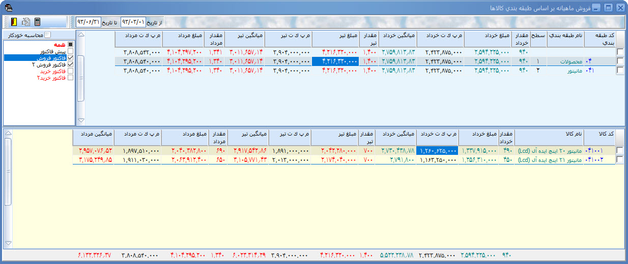 در جدول فوقاني پنجره، اطلاعات فروش ماهيانه براي هر طبقه بندي كالا ، جدول جمع تعداد، جمع مبلغ، جمع مبلغ پس از کسر تخفیف و جمع ميانگين فروش هر ماه براي همه طبقه بندي ها محاسبه مي گردد. لازم به ذكر است با انتخاب همزمان دسته فاكتور  خريد و فروش جمع تعداد خريد و فروش دريك ستون(به عنوان مثال جمع تعداد فروردين) نمايش داده خواهد شد.پس ميتوان گفت اين عمل اطلاعات درست و قابل استفاده براي اين گزارش نخواهد داشت لذا در زمان انتخاب دسته فاكتور ، دسته فاكتورهاي انتخاب شده بايد از يك نوع باشند.