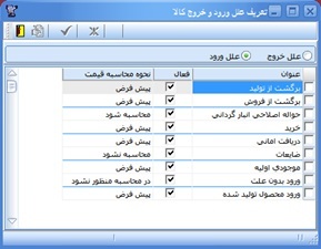 اين پنجره، به تعريف، اصلاح و يا حذف دستورالعملها و فرمهاي ورود و خروج كالا، تحت عنوان "علل ورود و خروج كالا"، اختصاص دارد. در واقع ميتوان به هر سند علتي را نسبت داد. معمولا علل ورود يا خروج در هرشركت تعداد مشخص و محدودي مي باشند .