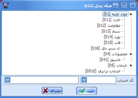 از طريق اين پنجره، مي‌توان يك طبقه‌بندي درختي و نامحدود را به طور مجزا و مستقل از روش كدينگ، براي كالاها تعريف نموده و سپس آنها را به اين طبقه‌بندي‌ها، اختصاص داد. لازم به ذكر است كه انجام اين عمليات در ابتداي راه اندازي و شروع به كار با سيستم ضرورتي نداشته و ميتوان تعريف طبقه بندي را در هر زماني انجام داد.