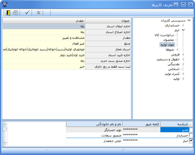 حدود اختيارات و سطح دسترسي يك كاربر در اين سيستم، در پنجره "انبار" و از طريق تعيين مجوزهاي زير صورت مي‌گيرد:
