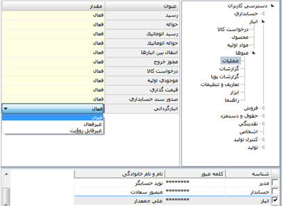 مدير : دادن اين مجوز به كاربر، بدين معني ميباشد كه وي مجاز به ورود اطلاعات، تهيه چاپ از آنها، انجام محاسبات و درج اسناد اصلاحي خواهد بود.