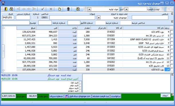در ابتداي هر سال مالي جديد، براي هر انبار برگه اي تحت عنوان "موجودي اوليه"، ثبت ميگردد كه مشخص كننده تعداد موجودي هر كالا در انبار مذكور ميباشد