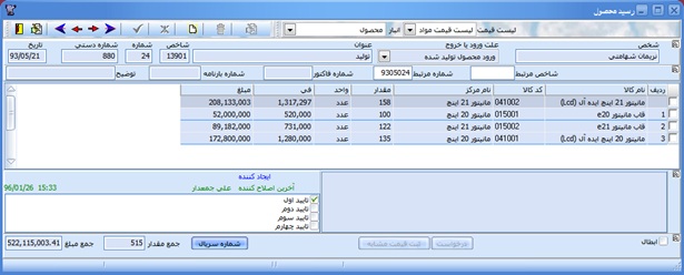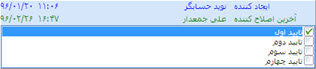 از مزاياي وجود اينگونه تاييدها، ثبت مشخصات كاربر و زمان انجام عمليات ميباشد. لازم به ذكر است كه بلافاصله پس از انجام اولين تاييد، كليه اطلاعات رسيد انبار به غير از ستونهاي "في" و "مبلغ"، غير قابل تغيير خواهند بود. پس از انجام تاييد دوم نيز مشابه تاييد اول، ميتوان اطلاعات ريالي رسيد را ثبت نمود. در تاييد سوم تمامي حوزه ها بجز "شاخص حسابداري" غير قابل تغيير خواهند بود و درصورتيكه تاييد چهارم صورت گرفته باشد، كليه حوزه هاي مندرج در رسيد، غير قابل تغيير خواهند شد.