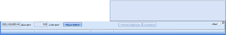 در صورت وجود درخواست كالاي مرتبط با كالاي انتخاب شده ميتوان توسط اين حوزه ارتباط بين درخواست و سند را مشخص نمود. با قرار گرفتن بر روي اين حوزه و كليك بر روي آن كليد انتخاب درخواست فعال ميشود، سپس با كليك بر روي كليد انتخاب، پنجره درخواست بازشده و رديف هاي مرتبط در پنجره درخواست (رجوع به فصل تعاريف و تنظيمات مبحث درخواست كالا) كه ميتواند با رديف مورد نظر مرتبط باشد نمايش داده مي شود و ميتوان تيك رديف مورد نظر را ثبت كرد تا در پنجره سند مشخص شود.