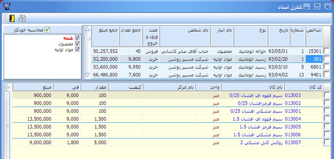 در جدول فوقاني اطلاعات اصلي اسنا نظير تاريخ، علت ورود و خروج و ...د و در جدول زيرين جزييات مربوط به سند مذكور نظير كالا، مقدار، واحد و ... ، نمايش داد خواهد شد.