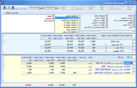 اطلاعات كلي موجودي طبقه بنديها در جدول فوقاني نمايش يافته و با انتخاب رديف طبقه بندي مورد نظر، جزييات آن در جدول پايين صفحه، نشان داده ميشود.