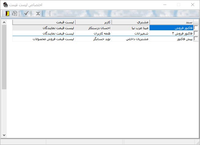 با توجه به تعريف ليست قيمت در بخش قبل ميتوان هر ليست قيمت را در دسته فاكتور هاي گوناگون به كاربران اختصاص داد تا در زمان صدور فاكتور، ليست قيمت مورد نظر به صورت پيش فرض براي آن شخص و كاربر انتخاب گردد. اين پنجره داراي چهار ستون سند(يا همان دسته فاكتور)، مشتري، كاربر و ليست قيمت مي باشد كه به ترتيب عبارتند از :